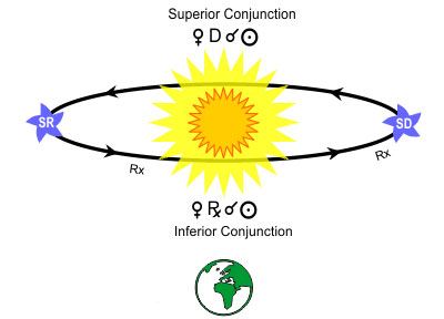 Venüs yaklaşık 19 ayda bir (584 gün) geri gider. Geri giderken Güneş’le birleşir (inferior conjunction) ve her 19 ayda bir yeni bir Venüs döngüsü başlar. (Bunu Ay’ın Yeni Ay fazına benzetebiliriz.) Yaklaşık 9,5 ay sonra Venüs tekrar Güneş’le birleşir. (superior conjunction) (Ay’ın Dolunay fazı gibi) Venüs her iki durumda da gökyüzünde görünmez.